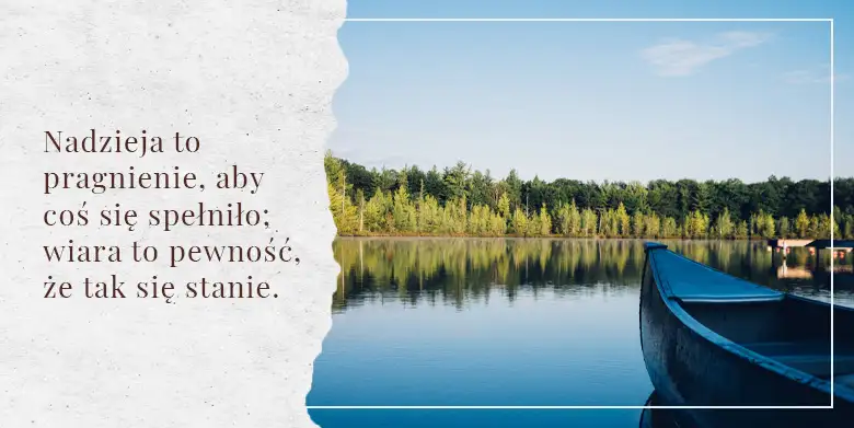 Emilie Batisse miała siedemdziesiąt dziewięć lat, kiedy została ranna w wypadku samochodowym i nie dawano jej wielkich szans na przeżycie. Kiedy Norman Vincent Peale przyszedł ją odwiedzić, zauważył rząd nowiutkich tomików poezji, które nie były otwierane. Kiedy ją o to zapytał, odpowiedziała: „Uwielbiam poezję, ale tych jeszcze nie czytałam… Zachowam je na starość”. Pani Batisse przeżyła i wielokrotnie przeczytała te tomiki, a kiedy zmarła w wieku dziewięćdziesięciu jeden lat, w planach miała podróż do Europy. Nadzieja to pragnienie, aby coś się spełniło; wiara to pewność, że tak się stanie. Nadzieja to pragnienie czegoś tak desperacko, że choć wszystko przemawia przeciwko, nadal wierzysz Bogu. Niezwykłe jest to, że sam akt nadziei wyzwala siłę.